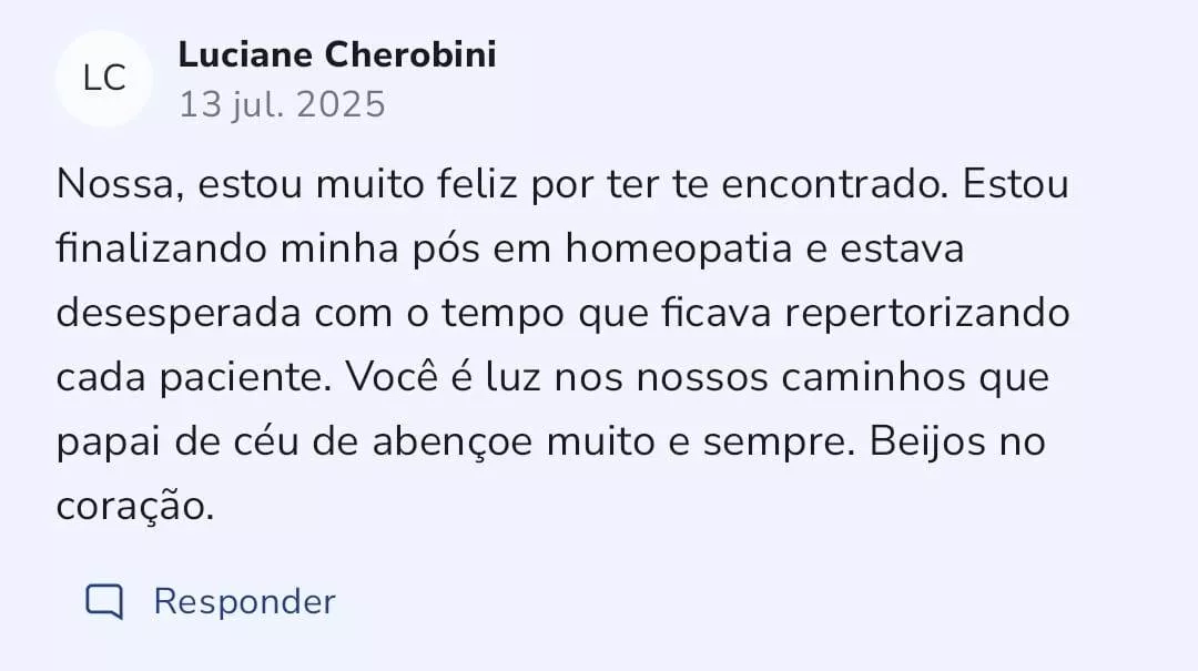 Você já começa a usar imediatamente! O curso é prático, intuitivo e rápido de aprender. Em pouquíssimo tempo, você já estará fazendo suas primeiras repertorizações com segurança e autonomia.