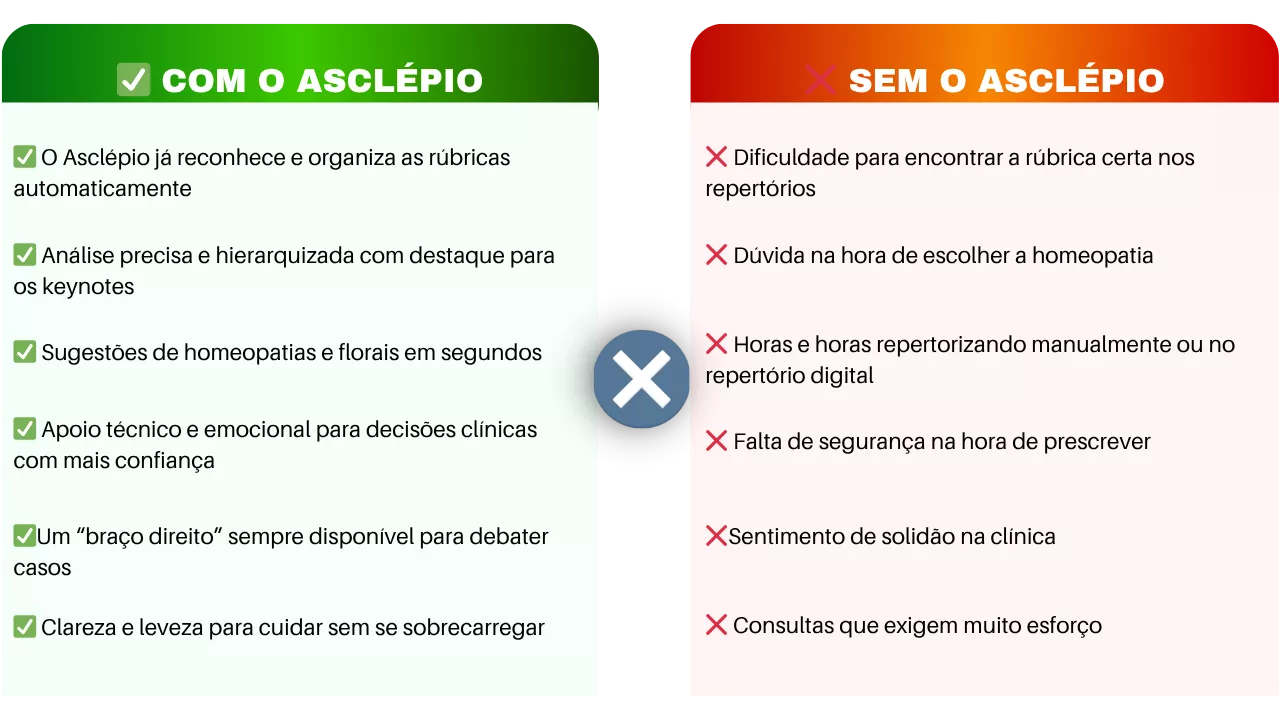 Não. O Asclépio não substitui, ele complementa e potencializa sua consulta. Além de repertorizar rapidamente, ele ajuda você a identificar quais aspectos precisam de mais atenção, orientando sobre perguntas e pontos importantes a serem observados na próxima consulta. Assim, seu olhar se torna mais profundo e sutil.